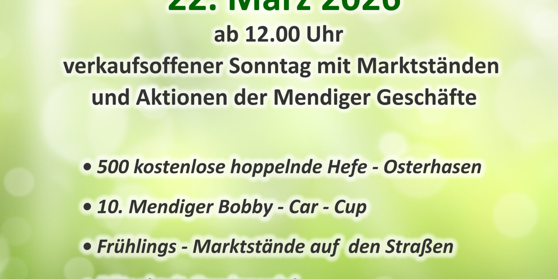 Wieder einmal hat die Werbegemeinschaft sich einiges einfallen lassen und lädt uns ein die Mendiger Innenstadt mit den geöffneten Geschäften, mit vielerlei Aktionen und Frühlings-Marktständen auf den Straßen zu erkunden.