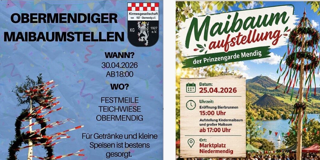In Niedermendig freut sich die Prinzengarde am 25.04.2026 ab 15:00Uhr (Eröffnung des Bierbrunnens) auf fröhliche Gäste und am 30.04.2026 ab 18:00 Uhr wird die Festmeile auf der Teichwiese in Obermendig zum Treffpunkt für alle Freude dieser traditionsreichen Veranstaltung .