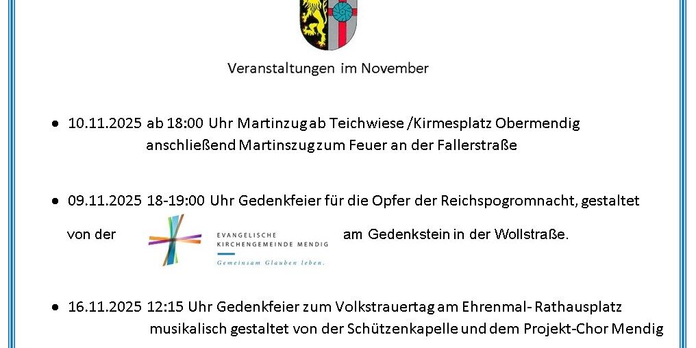 Der Volkstrauertag am 16.11.2025 um 12:15 auf dem Rathausplatz wird wieder musikalisch begleitet von der Schützenkapelle Mendig und dem Projekt-Chor Mendig unter Leitung von Anita Reuter. Die Ansprache hält in diesem Jahr der Schriftsteller Markus Theisen.