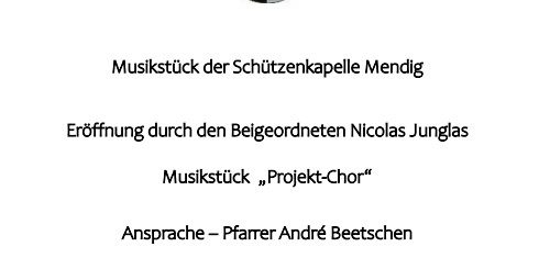 Nov.142024Die Stadt Mendig lädt zur Gedenkstunde zum Volkstrauertag am 17.11.2024 12:45 Uhr am Ehrenmal auf dem Rathausplatz ein. Kategorie: Neues aus dem Rathaus14. November 2024Post navigationVorherigerPrevious post:Die Stadt Mendig lädt alle Bürgerinnen und Bürger ein !NächsterNächster Beitrag:Neujahrskonzert der Stadt 2025: „Eine heitere Nacht in Venedig“Ähnliche BeiträgeWeihnachtsmarkt 202525. November 2025Einladung zum Volkstrauertag 202512. November 2025Stolpersteine – Gegen das Vergessen!5. November 2025Neuer Marktstand kam bei der Premiere sehr gut an3. November 2025Stadt und Anlieger empört über Pflanzendiebstahl in Obermendig21. Oktober 2025Veranstaltungen im November 202520. Oktober 2025